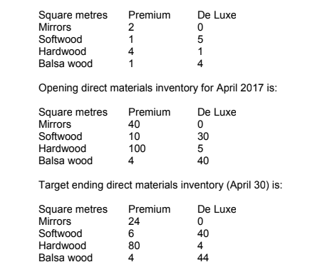 De Luxe wardrobes - medium sized wardrobes with an innovative shelving solution Direct manufacturing labour is 3 hours for the premium wardrobe and 5 hours for the De Luxe. The budgeted direct material usage for each product in 2017 is: