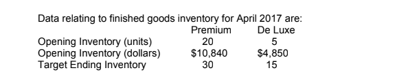 Budgeted sales for April 2017 are 740 units of the premium and 390 units of the De Luxe. The budgeted selling prices per unit in April 2017 are $1,020 for the Premium and $1,600 for the De Luxe.