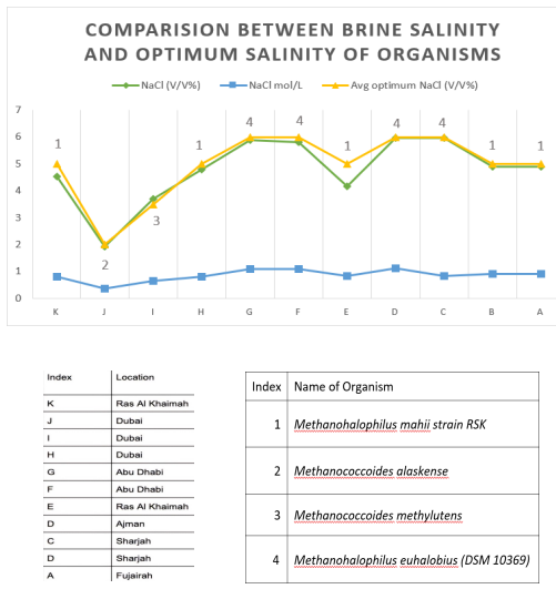 Figure 2.21 Rectilinear graph comparing the salinity of brine concentrate from11ROplantsintheUAEwithoptimumsalinitiesofvarious Halophilic methanogens