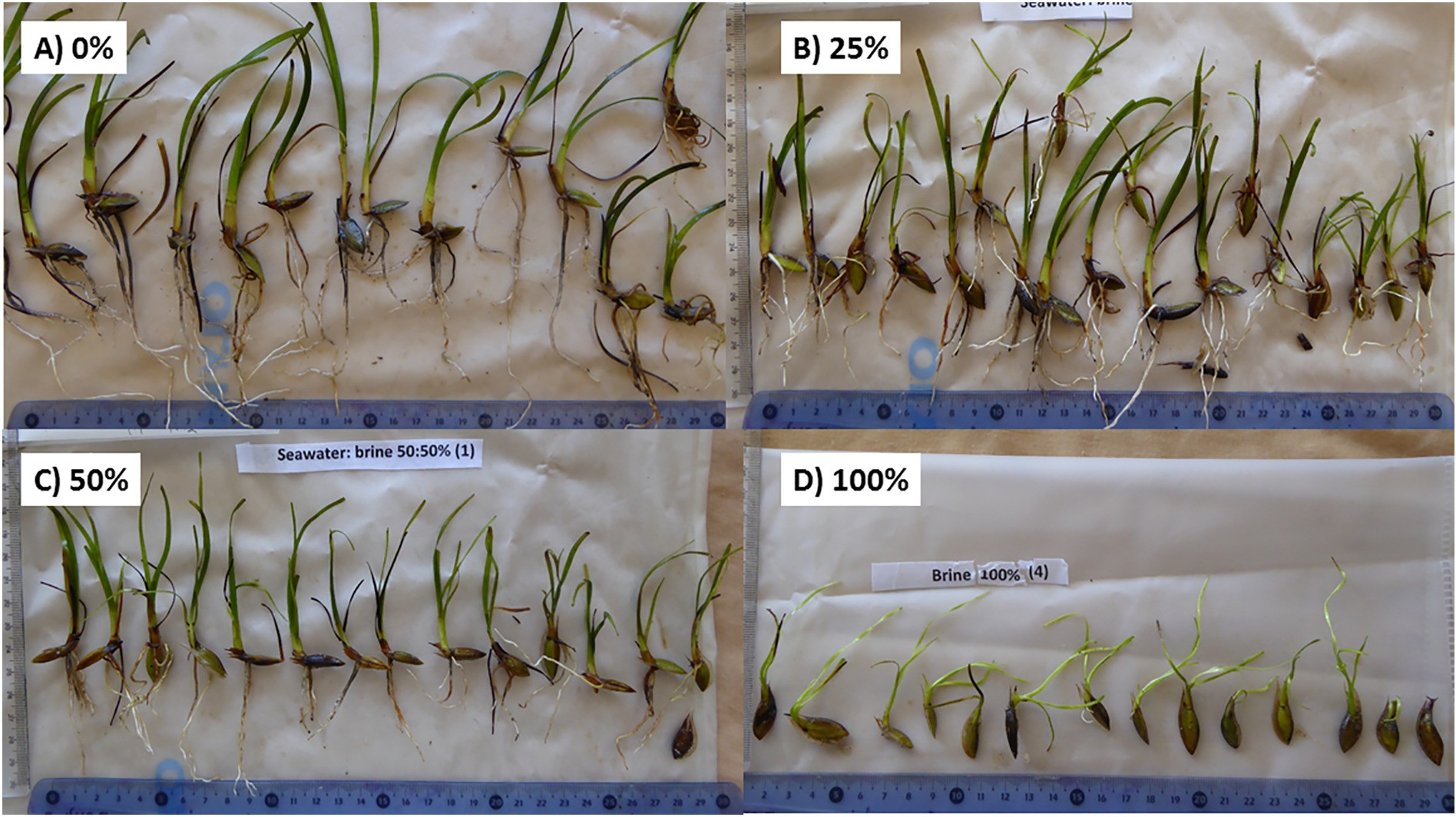 7weeksexposuretobrines(0,25,50and100%)showing reduced leaf shoot and root growth.