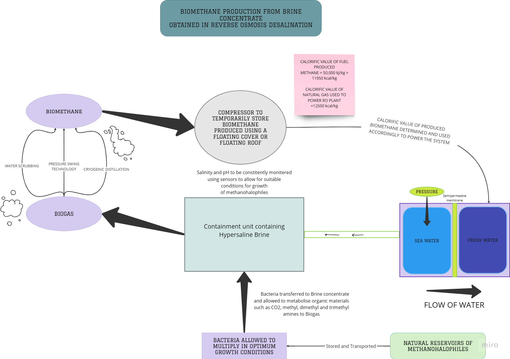 Reverse Osmosis (RO) Desalination is one of the primary methods to produce desalinated water, especially in countries where there isaseverescarcityoffreshwater reservoirs. UAE is one of the leading giants in desalination technology, with over 140 operational desalination plants that contribute to 42% of the total water requirement of the country and 14% of the worlds total desalinated water. However, there is a rising concern regarding the largeamountofbrinerejection(alsoknownasbrineconcentrate) that is produced by these massive plants. Like many other countries, UAE primarily disposes its brine into the surrounding water bodies. This disposal of brine causes severe consequences to the marine ecosystem due to the difference in pH and salinity of the brine when compared to normal ocean water. Studies have also suggested that prolonged disposal can negativelyimpacthumanlifeaswell,duetotheaccumulationof toxins through biomagnification. Due to these concerns, the importance of arenewable and sustainable method of recycling the brine produced has come into picture. This study explores the use of four species from the family Methanosarcinacae to produce biomethane from the brine concentrate. Methane in its purified form is a renewable source of energy that has high calorific value (around 50,000 kJ/kg or 11950 kcal/kg) which can act as a fuel substituting diesel and natural gas, which aregenerallyusedto power the RO plant. The presence of CO2and other trace amounts of organic compounds such as DMA (Dimethylamine), TMA (Trimethylamine) and Methanol in brinerejectcanfacilitatemethaneproductioninthesemicroorganisms.Thesalinitylevel of the brine reject produced by all the major RO plants in the UAE was explored and matched with the optimumgrowthconditionsofthefourspecies.Thisnovelmethodcan preventenvironmentaldamagecausedbytheexistingmethodofbrinedisposalandcan also reduce the carbon footprint of the desalination plants across the country.