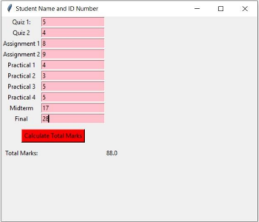 Write a Python GUI Application program that allows the user to enter the marks for different assessments in a unit, and computes the total mark and grade for the unit.