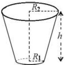 The paper cup shown below has Radius R2 = l.5R1, height h, volume V = 716 cm3, and surface area S. The height, volume, and surface area of the cup are given by: