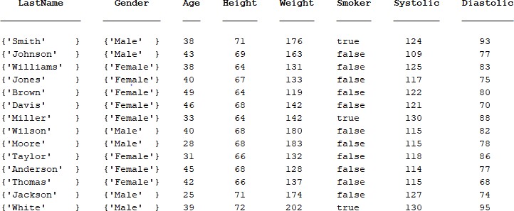 A sample data from the patients.mat file within the Matlab library is shown in Figure Q1-1. This consists of a table with the list of LastName, Gender, Age, Height, Weight, Smoker, Systolic, Diastolic.
