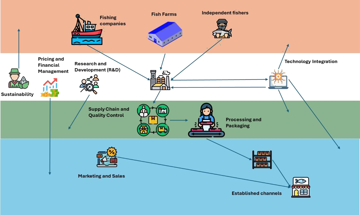 - Market and sell seafood through established channels, focusing on customer relationships and brand building.