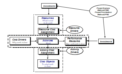 The horizontal axis contains the process view. The cost driver is the agent that causes the activity to utilise resources to accomplish some designated work. In this view the activity is some type of active work centre. The performance measure of activities entity houses the evaluative criteria by which the organisation can determine the efficiency and effectiveness of the activities work effort (Miller, 1996).