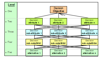 Analytic Hierarchy Process (AHP) was developed to structure complex, multi-attribute problems. It creates a hierarchical structure based on goals, criteria, sub-criteria and alternatives (Angelis & Lee, 1996; Saaty, 1982).