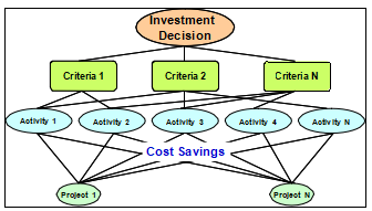 The initial application of the model started with the identification of the main criteria. The projects are then placed after the main criteria (Fig. 8). The main objective in pursuing this modified model is to sell the concept to prospective customers without the intricacies involved in the gathering of ABC information. The cost savings information did not come from the savings on resources consumed by activities. Cost savings were replaced by cost benefits with the use of the existing financial analysis. Once the prospective users agree that the concept improves their existing method, ABC information build-up will be the next logical step to pursue the complete ideal model in the theoretical framework.