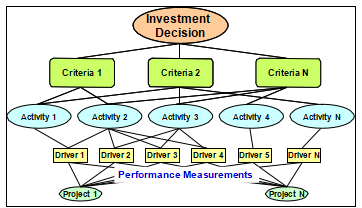 Figure 9 is the initial application of the model in the project simulation. Notice that the activities are not included. The model introduces the performance measures as sub-criteria. These are linked to the main criteria using the analytic hierarchy process. This model incorporates the performance of each project with respect to the performance driver of each main criterion contributing to it. There are no limits in the number of alternatives for as long as performance measures are defined.