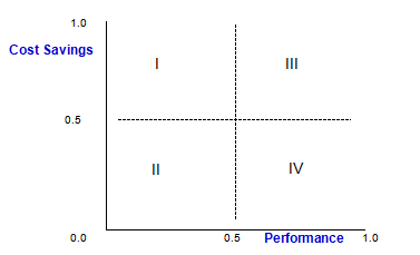 Combine the results of the cost and performance models to select the best investment. The models assign a weighted evaluation to each investment alternative, one for cost and one for performance (Angelis & Lee, 1996). Use a graph in Fig. 6 to select the best alternative. Investments falling in quadrant III are the most preferred, while those falling in quadrant II would be the least preferred (Angelis & Lee, 1996).