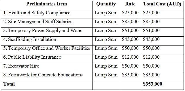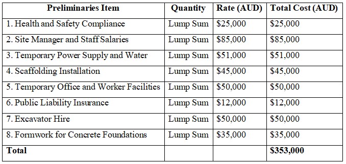 The task is to price selected preliminaries from a set of categories. The objective is to prepare a strong and competitive estimate that shows accurate cost allocation, efficient resource utilization, and compliance with all relevant regulations and project requirements. Demonstrating effective research and estimating skills will ensure the production of a preliminary estimate maximally to increase our chances of securing the contract.