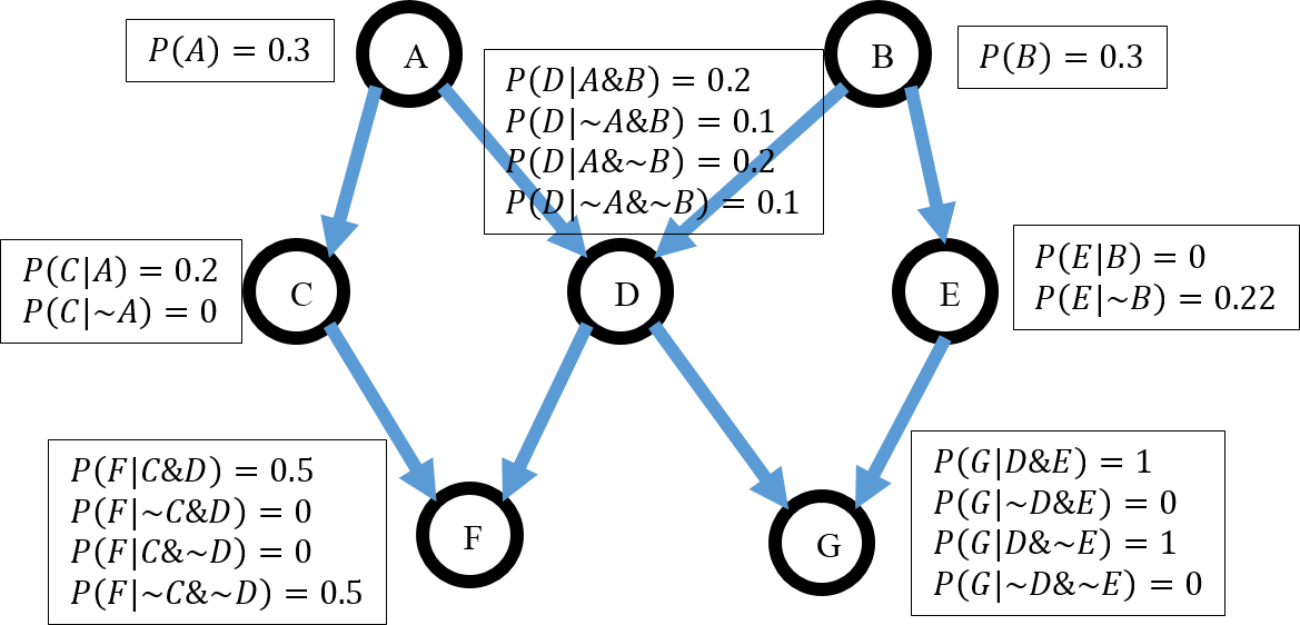 Task 3. (20 marks) Describe the structure of Bayes net: what are vertices, directed edges between vertices, and what information do we keep with vertices? Give the definition of con- ditional independence. Compute the probabilitiesP(C&G) andP(B|F) from the given Bayes net (see figure ?? :