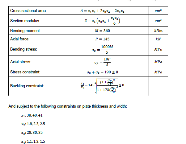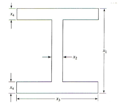 An I-beam is shown in the figure to the right. Given the following equations and constraints, develop a mathematical model and find the dimensions of a beam with a minimal cross-sectional area.
