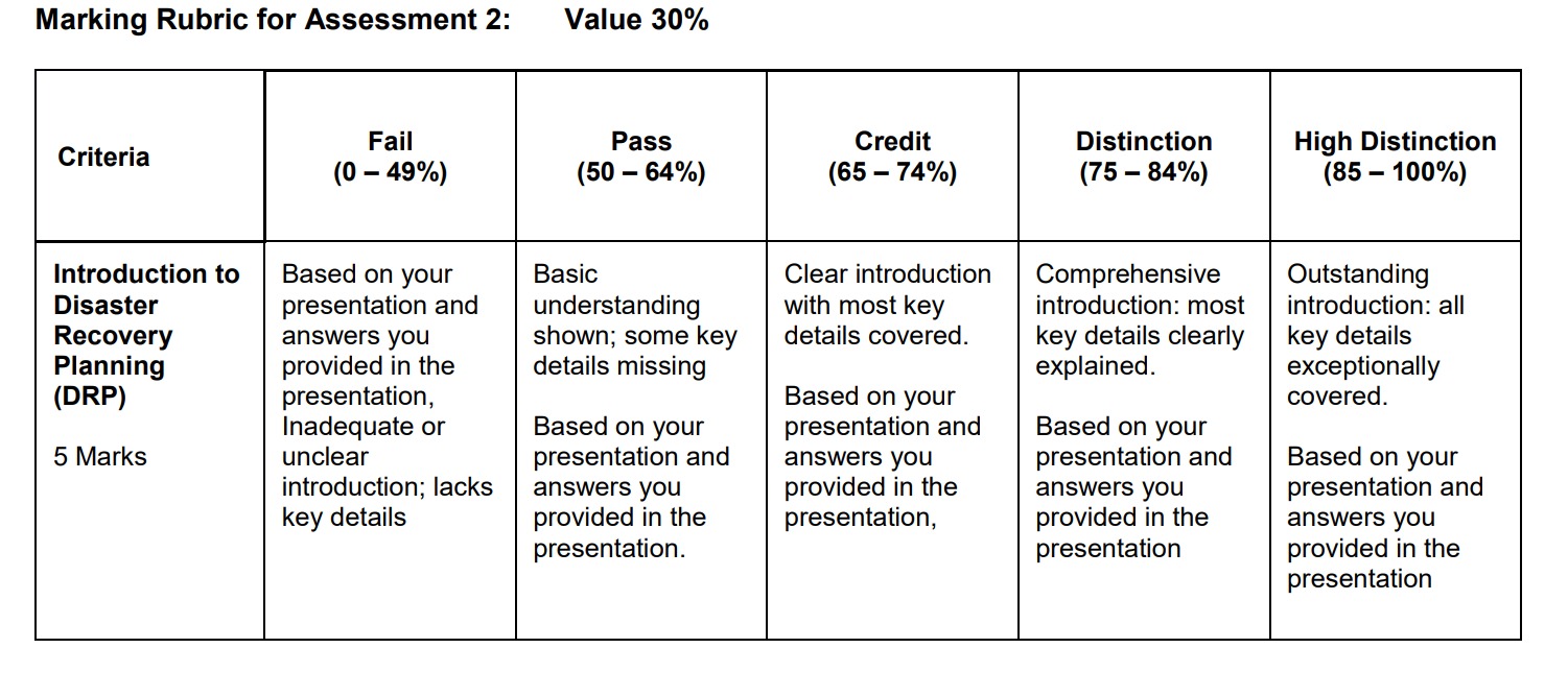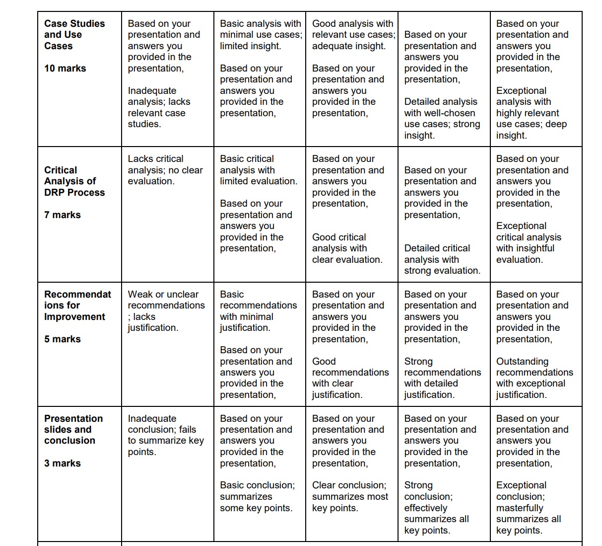 disaster recovery planning (DRP) process within the context of information security. Students will explore how organizations can prepare for, respond to, and recover from disasters that impact their information security infrastructure. Based on learning from exploration, then they will assume an organization and will make DRP for that organization. The assessment will involve analysing real-world use cases, identifying strengths and weaknesses in existing DRP processes, and proposing improvements based on current best practices and theoretical frameworks.