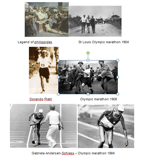 Question 13.The images below are from several Olympic marathons over the years. What can be stated about these images as proof of why athletes may collapse at the end of long races? Outline what other concurrent information/evidence you may gather to supplement these images to develop conclusions about the event's consequences. Fill out the text box on the next page with your response.