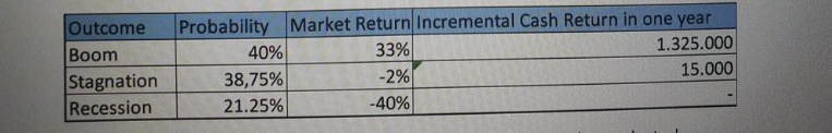 Although there is no traded substitute for this investment, the you are able to come up with some scenarios for the incremental cash flows that the investment will generate. These are tied to the overall economic situation. Assume for this question that the CAPM holds and that the risk-free return over the next year is 0.5%.