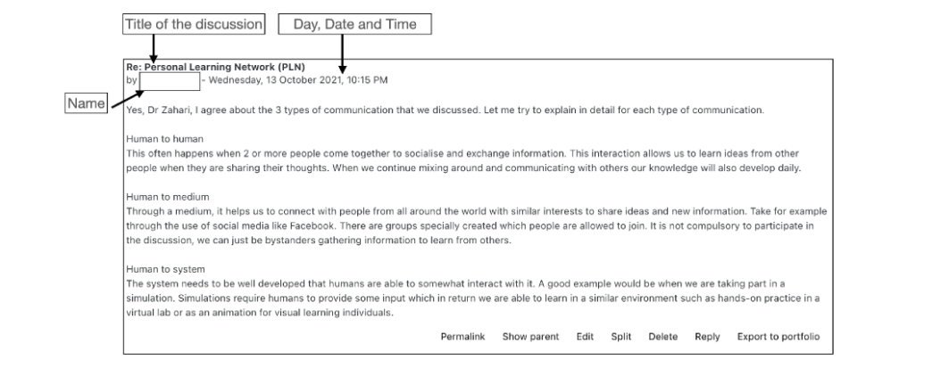 - The screenshots should contain the Name, Title of the discussion, Day, Dateand Time.