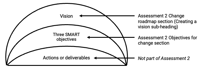 Delete this text box from your submitted assessment Change roadmap (up to 900 words) Develop a change roadmap for the organisation, describing what is needed to achieve the objectives you identified in the previous section. You must use the eight sub-headings provided in the template below, which are drawn from KottersEight Steps to Transforming Your Organisation. Please note: The change roadmap applies to your change initiative as a whole(the title and three objectives you described above) you dont need to address each of the three objectives under each of the eight headings below. The vision is distinct from the SMART objectives you described in theObjectives for Changesection above (see diagram). References should be included where appropriate. Kotters Eight Steps to Transforming Your Organisation are covered in Module 3: Change and are described in the readings for Module 5.1. |