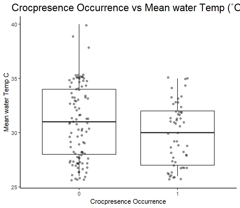 Crocodlyus porous, or through its common name of Estuarine saltwater crocodiles, was the testing subject in this observational study to determine crocodile population abundance through both temperature and rainfall. The data expands over 40 years. Over the years, crocodile management has changed from killing crocs to prohibiting certain rivers so that the crocodile population can rise again, which will be how the data is presented and compared to the rivers where crocodile removal occurs and where it does not based on the temperature and rainfall variables. The data will be collected through the Government NT Parks and Wildlife Department, and with the raw data of crocodile presence, After-Before, Control-Impact, Mean Temp C and Annual Mean rainfall mm, Calculations will be made to calculate the data summary, box plots, geombar plots, and tables, further understanding the effects of temperature and rainfall on crocodile populations. The results showed that temperature had more impact on crocodile presence than rainfall, and undisturbed rivers always had a higher crocodile presence before and after the ban. This would indicate that swimming within the controlled areas is safer than those left alone. The conclusion is that the crocodile population has increased after the ban and is significantly higher within areas undisturbed.