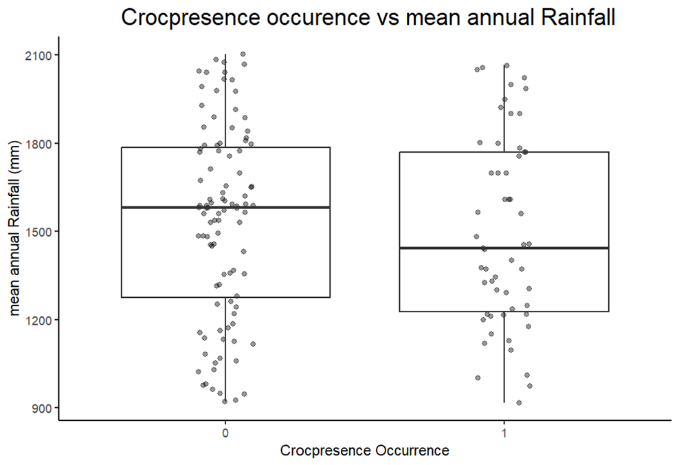 Graph 1 shows a higher count where no sightings were made, represented by the 0 box plot, than with actual crocodile sightings, represented by the 1 box plot. The IQR is higher for the no crocodile sightings compared to that where crocodile sightings did occur.