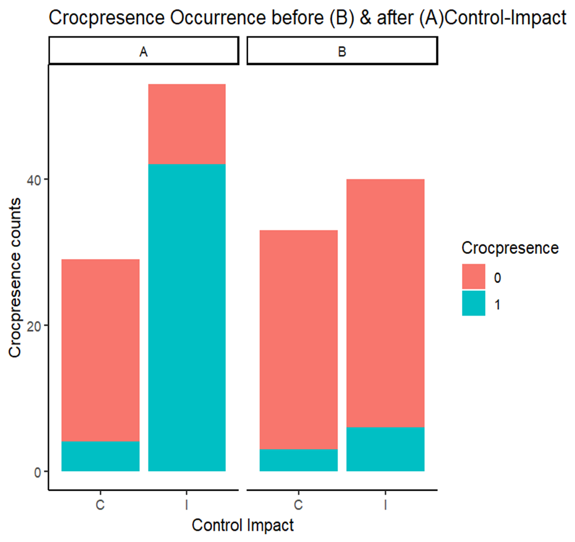 include the collected data from 1960 to 1971 and 1972 to 2020 on the Northern Territory rivers. Of this data, crocodile presence (1) was identified, and (0) was unidentified during the surveys. These were conducted within controlled ( C ) rivers monitored to remove crocodiles, whether culled before or relocated after the ban; the Impact areas are those where croc culls were prohibited, and removal today is not allowed. The mean temperature and rainfall for each river type were recorded during these surveys. (e.g., Fukuda et al. The data will be calculated through a software application called R Studio.