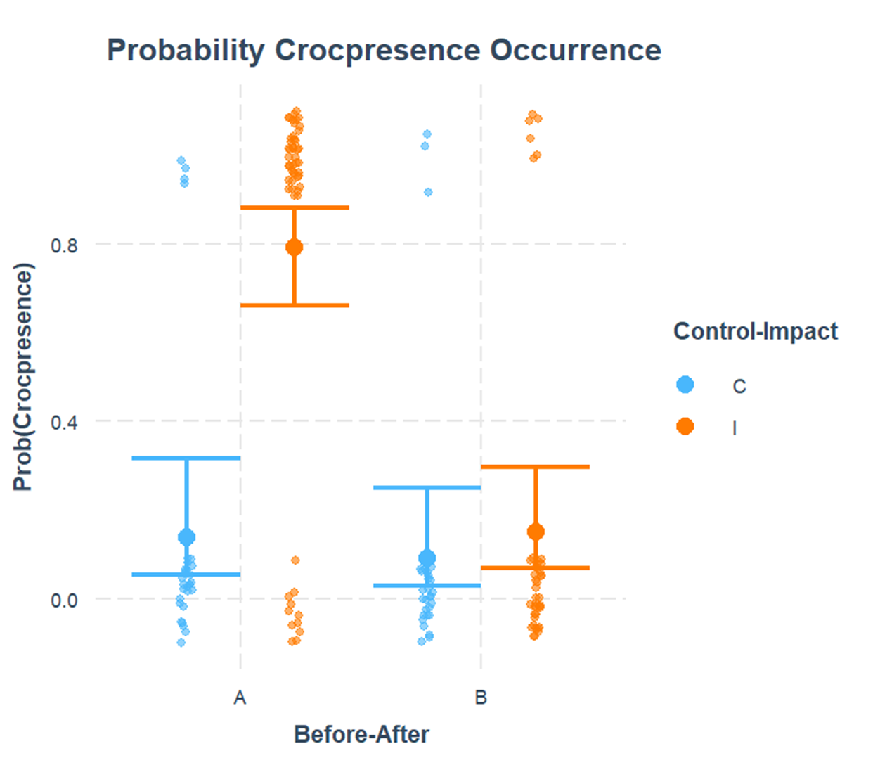 This data shows that the probability of sighting a crocodile will always be higher in the impact areas. Even though the mean for both control and impact was less than 50?ter the ban, it is seen that the control is still under a mean of 50%, unlike the impact, which has reached a mean of 80% .