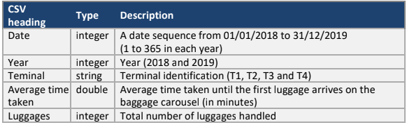 In this assignment, we will be conducting an investigation of the luggage handling systems efficiency at Melbourne airport. You have been presented with data across four terminals (T1, T2, T3, T4) in Melbourne Airport for the period 1 January 2018 to 31 December 2019. The airport is interested in understanding the efficiency of the luggage handling system across the 4 terminals and also to gauge if the automatic luggage scanners have made a difference in the efficiency of the luggage handling process. The researchers collected data on the average time taken for the first suitcase to arrive on the baggage carousel across all flights in a day. The researchers also collected data on the total number of luggages in the same time period. On 1 Jan 2019, the airport introduced the automatic luggage handling system in Terminals 2 and 3.