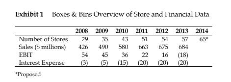 The Weichel Group also felt B&B could support a large line of credit. From its beginning, B&B had operated on the founders belief that it should grow only as fast as its earnings would allow. It had taken on debt only twice: to build its present office warehouse and to expand into New York City. The Weichel Group obtained a $400 million line of credit to accelerate the opening of additional stores. This initiative resulted in B&B having 57 stores at the time of the IPO, with plans to open eight more in 2014. The Weichel Group also used the credit line to pay off the founders and pay itself a sizable dividend. These moves had pushed the companys debt from almost nothing in 2008 to over $368 million in 2013.