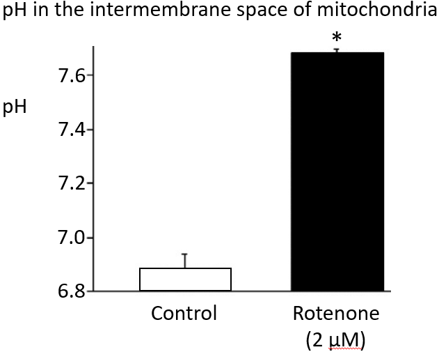The figure compares the pH of the intermembrane space of mitochondria in control cells with cells that have been pre-treated with rotenone. Explain the difference in pH between the control and rotenone-treated cells. [Maximum 2 sentences]