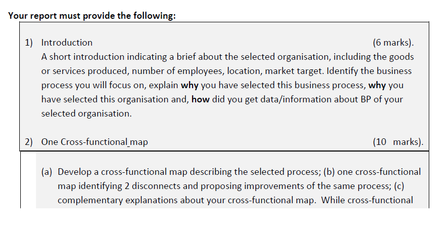 Option 1. Select an organisation where you can investigate one of its main business processes. This organisation can be large or small; for profit or not for profit. You could select an organisation you work for, an organisation you have previously worked for, or an organisation where a relative/friend works. Then, select one key business process where you can access information for your report.