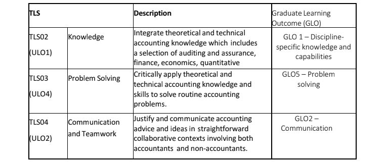 TLSs are the minimum accounting discipline national standards graduates are expected to meet or exceed upon graduation. This assessment item provides students with the opportunity to develop and evidence the following TLSs that are aligned to the Deakin graduate learning outcomes (DGLO) and more importantly the Unit learning outcomes (ULO):