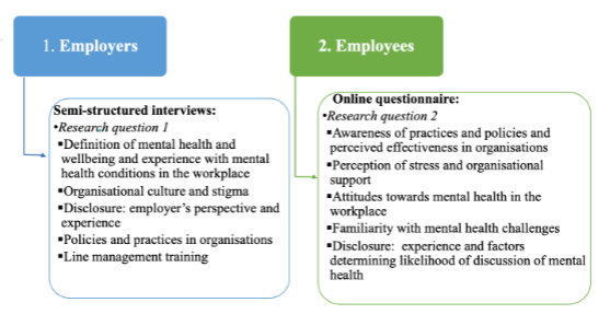 For the purpose of this project, a concurrent mixed methods approach has been chosen as this allows for the separate use of qualitative and quantitative methods within one phase of data collection and provides a richer and more comprehensive response to the research question (Saunders et al., 2016, p.171). The use of two different techniques moreover allowed for a more comprehensive exploration of employers and employees perspectives (Bryman & Bell, 2015). The study combined elements of exploratory research as it set out to understand the relationship between stigmatizing attitudes, levels of support within organizational cultures, and disclosure of MHCs as well as evaluative research elements as this study looked at companys actions and their effectiveness (Saunders et al., 2016).