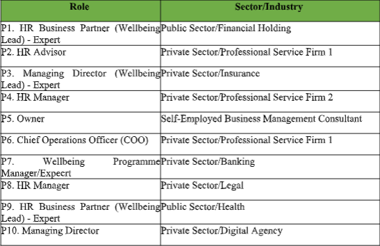 Participants for the semi-structured interviews were chosen from a pool of individuals, who expressed their willingness to participate in the research by filling out an online form introducing this research project, which has been distributed through the corporate intranets. The participants were thus selected from a pool of volunteers, following a non-probability purposive sampling (Bryman & Bell, 2015). As the interviews aimed at portraying the employers perspective, the individuals chosen were either HR professionals or individuals in a (senior) management position as they were considered to have most inside in the organizations business management and organizational attitudes towards MH and wellbeing. Three of the interviewees did not only speak for their current organization but were considered experts as they take an active participation in developing wellbeing programmes inside their organisations, hence they offered a deeper and comparative look at the management of MHCs in other organizations as well as their own. As Table 1 outlines, participants came from the private, public and third sector as well as different industries, which attributes to the datas validity and reliability (Collis & Hussey, 2013).