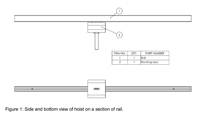 The hoist is a ceiling mounted type and Figure 1 shows a drawing of the side and bottom of a section of rail with the hoist mechanism (Housing assembly) attached.