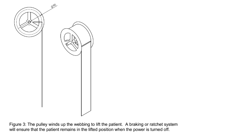 This is not complete as there would also be a rechargeable battery and a motor controller in thehousing as well as some braking or ratchet mechanism for the pulley. The Pulley Assembly consistsof a pulley and a length of webbing that winds up on the central spool. This is shown in Figure 3where the spool diameter is 90 mm, and the outer diameter is 105 mm; the thickness of the webbingis 1 mm.