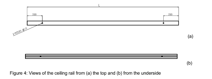 The rail comes in a number of lengths to suit the rooms in which the hoist is used. Top and bottom views are shown in Figure 4 that shows the position of the holes used for mounting to the ceiling.