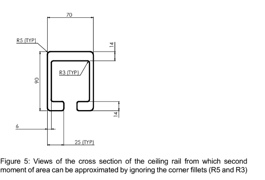 For the purpose of calculation, this can be treated as a beam simply supported at the mounting holes and a point load acting at the position of the centre of the housing (see Figure 1). The cross section of the rail is shown in Figure 5, from which the second moment of area can be approximated by ignoring the corner fillets dimensioned as R5 (TYP) and R3 (TYP) on the drawing.