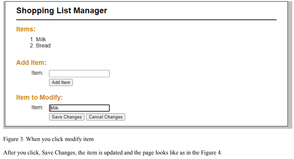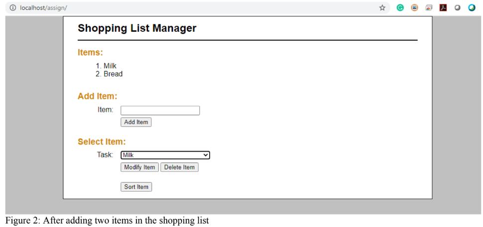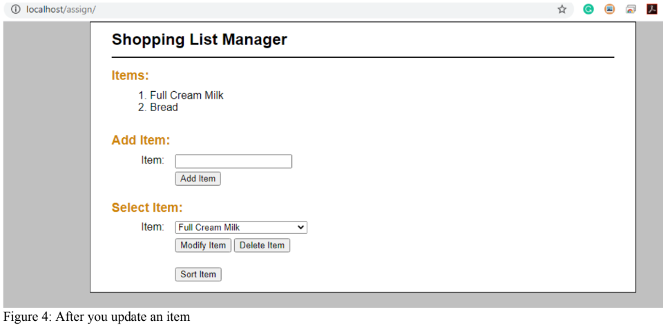 Implement Add Item button which is used to add shopping items in the list. Delete button is to delete the selected shoppingitem. Use the array_push() function to add a new item to the list. Modify Item button lets the user modify an existingitem. If the user clicks on the Modify Item button, this code should hide the form that contains the Modify Item button, andit should display the form that displays the current item in a text box and includes buttons that lets users save or cancel theirchanges.