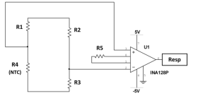 The electrical resistance of the thermistor changes as the temperature changes. A common temperature measurement system uses a Wheatstone bridge circuit in combination with a differential/instrumentation amplifier circuit (presented in Figure 2). The Wheatstone bridge