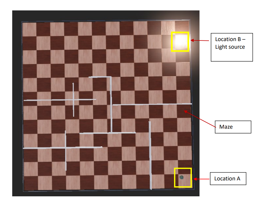 In this assignment, you are required to write C language code to autonomously move an E-puck robot from Location A to Location B as shown in the following figure using the WeBot simulator. Follow the Webot tutorials in Weeks 2-4 to learn how to achieve these goals.