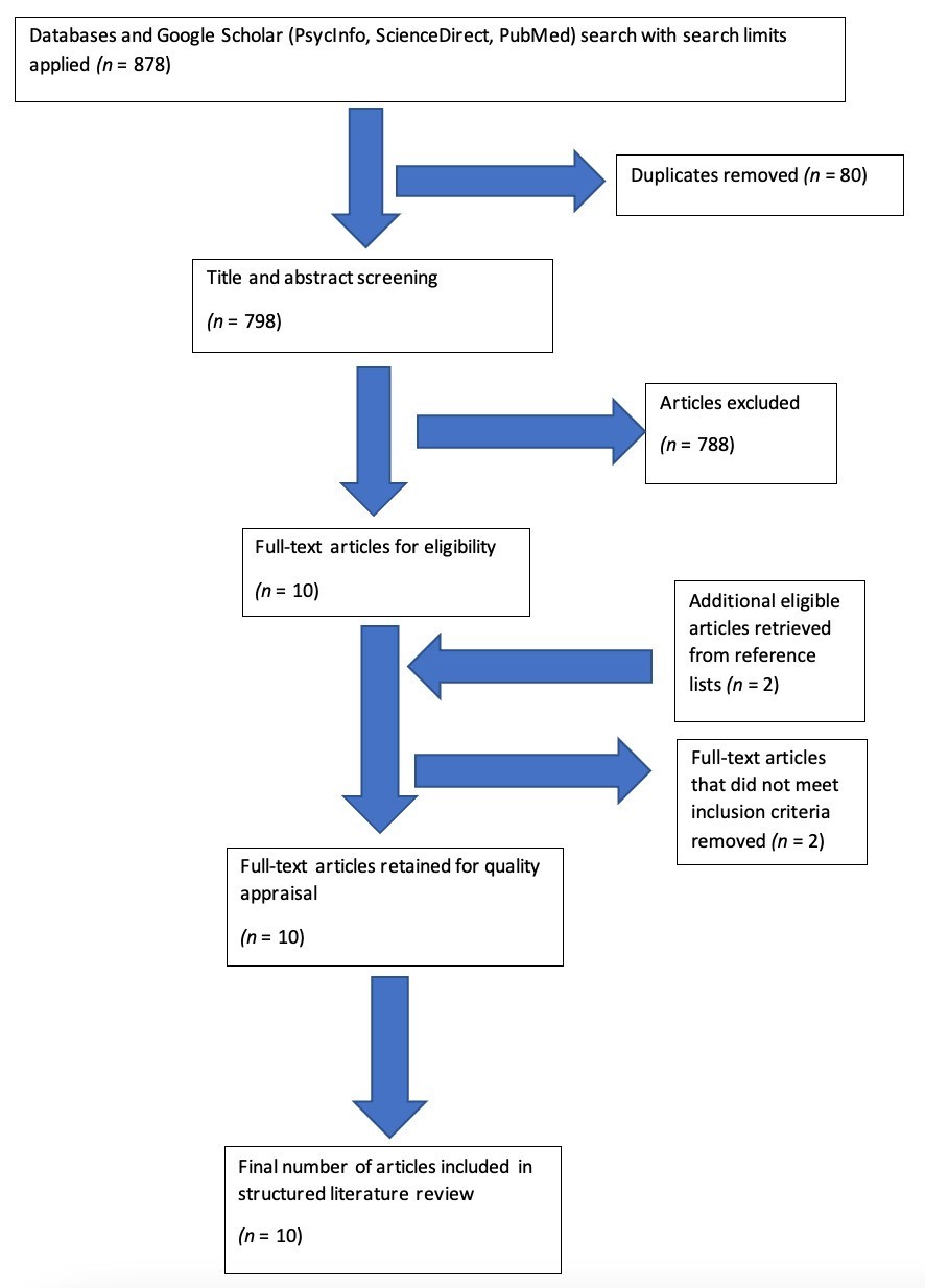 The databases were searched in sequential order. The combined search terms were used in the selected databases, and a manual search was conducted using Google Scholar search engine to identify any other relevant literature. Hand searching of the selected papers reference lists resulted in the retrieval of an additional two papers. Titles and abstracts were screened after duplicates had been removed, and relevance was assessed against the pre-designed inclusion criteria for the review. Studies that met or could potentially meet the inclusion criteria were retrieved in full for critical appraisal. Initially, the search returned 876 articles, and after the screening process and duplicate removal, 10 articles remained. The search process and results are presented using a PRISMA flowchart (Moher et al., 2009; see Figure 1).