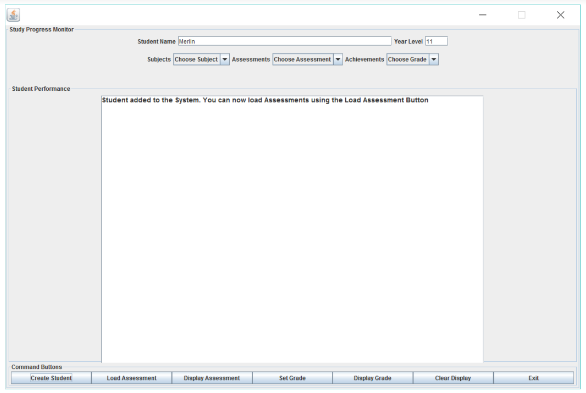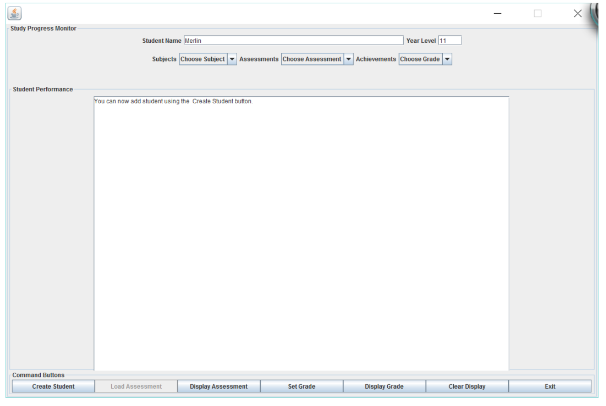 - A bottom panel that contains seven Buttons which are Create Student, Load Assessments, Display Assessments, Set Grade, Display Grade and Quit.