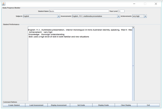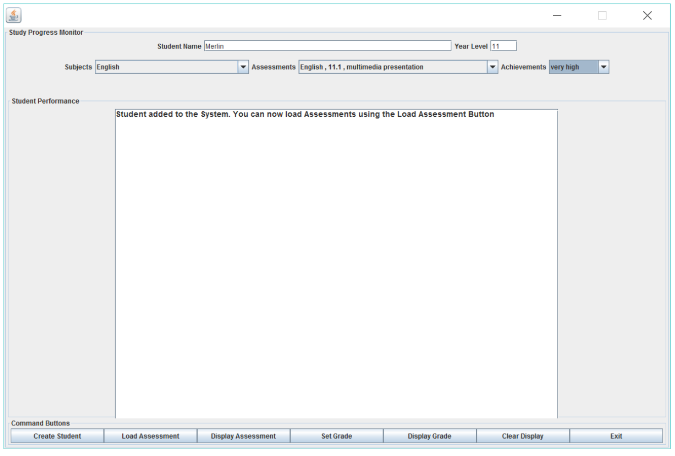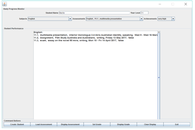 Year 11 and 12 students study subjects generally known as Authority subjects or Authority registered subjects. There are many assessments for these subjects in different formats and the grade of these assessments are summative contributing to a students final result. Entrance to further studies are based on this result and therefore, grades of assessments are critically monitored by students, and their parents. Your task is to develop aJava Applicationfor the parents and their year 11/12 kids to monitor academic performance easily. The java application should allow the user to enter student details, and assessments for each subject. Once the assessment results are available the user should be able to set the grade for the assessment including explanatory notes. User should be able to view the subjects enrolled, all assessments for a chosen subject, and all marked assignments with their grades.